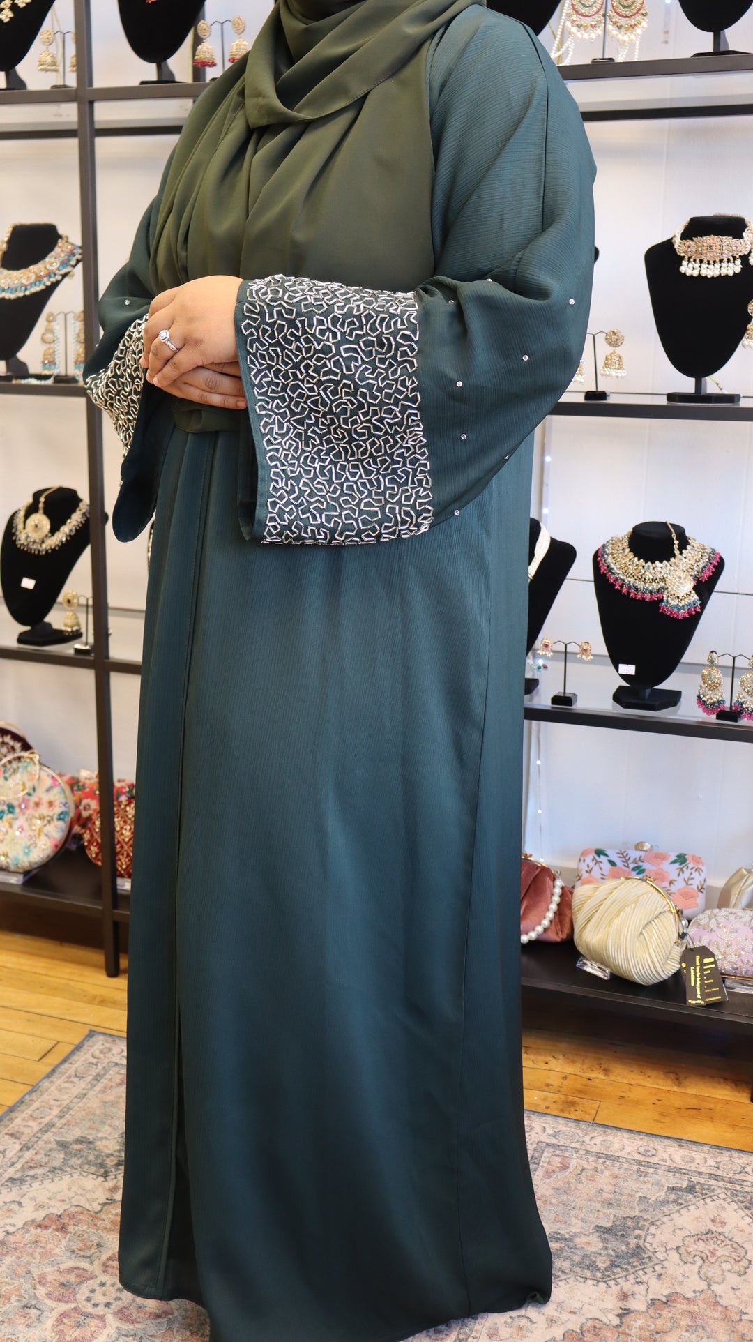 Green Premium Elegant Designer Abaya In Korean Zoom Fabric with Matching Georgette Hijab. [sku A100100]
